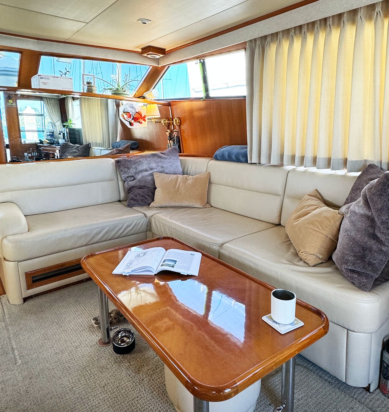 The spacious salon has room for everyone to kick back. The coffee table cleverly doubles as a dining table, and there's a stowaway table in our breakfast nook. Which is also a great perch to watch the fishing action outside or keep an eye out for wildlife.